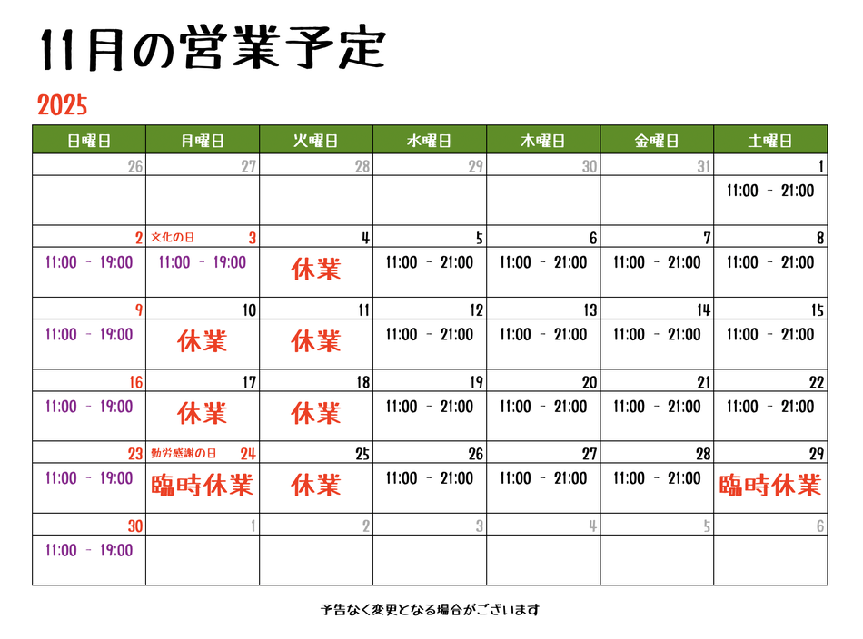 (月)(火) 定休 <月曜日が祝日の場合は営業いたします(11:00 - 19:00)>